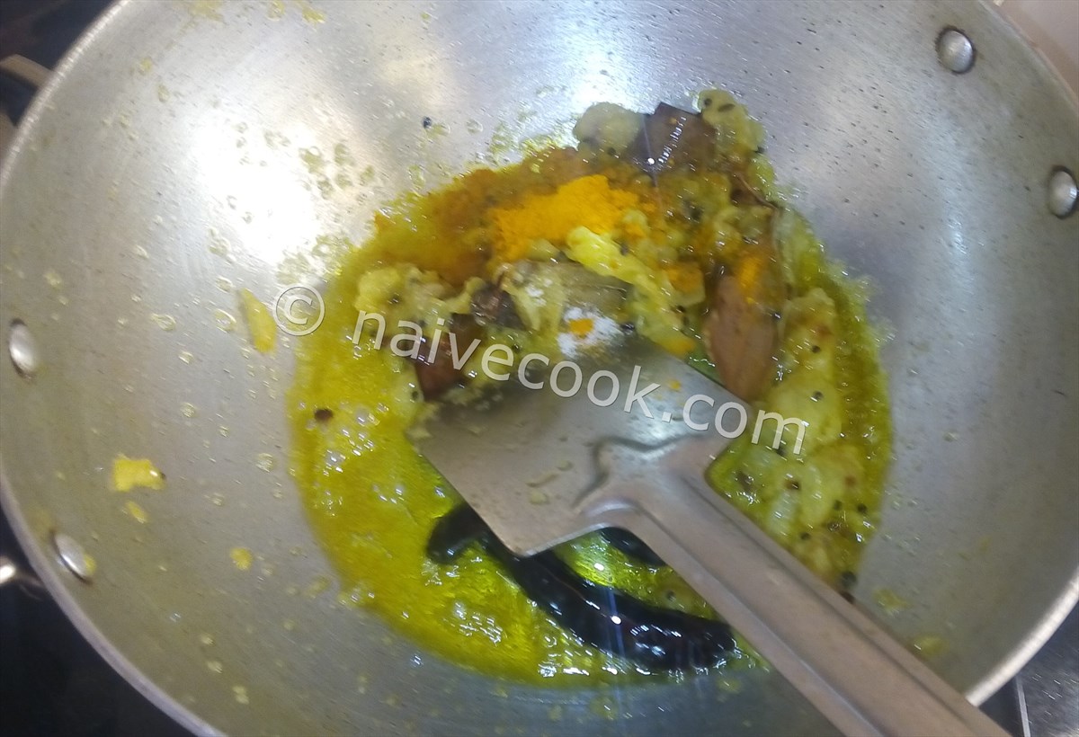 - When pulp start breaking, add turmeric and salt and mix well. Stir for another 2 minutes.